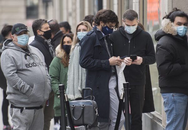 People wear face masks as they wait to enter a store in Montreal on Dec. 5, 2020.Graham Hughes/The Canadian Press