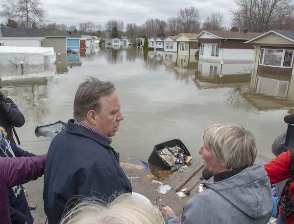 Quebec Premier François Legault and Sainte-Marthe-sur-le-Lac's Mayor Sonia Paulus visit the flood zone on May 2. Two weeks later, residents of the town were told new draft flood maps from the province may declare 1,500 homes to be in a 'flood zone.'Ryan Remiorz/The Canadian Press