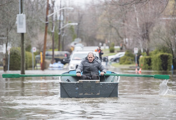 A man rows a small boat down a street surrounded by floodwaters on Île-Bizard, west of Montreal, on April 27.Graham Hughes/The Canadian Press