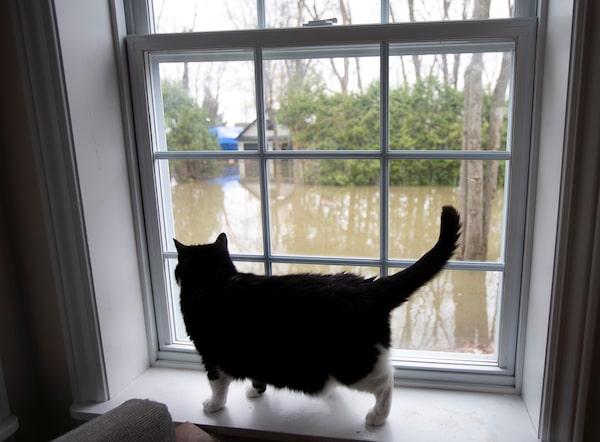 Above, a cat looks out the window at the flooded streets of Sainte-Marthe-sur-le-Lac on April 28.CHRISTINNE MUSCHI/Reuters