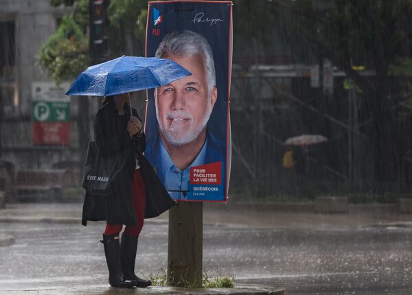 A woman shelters herself from the rain on Montreal's René Lévesque Boulevard next to a poster of Liberal Leader Philippe Couillard. The Liberals have governed Quebec for 13 of the past 15 years.Dario Ayala/The Globe and Mail