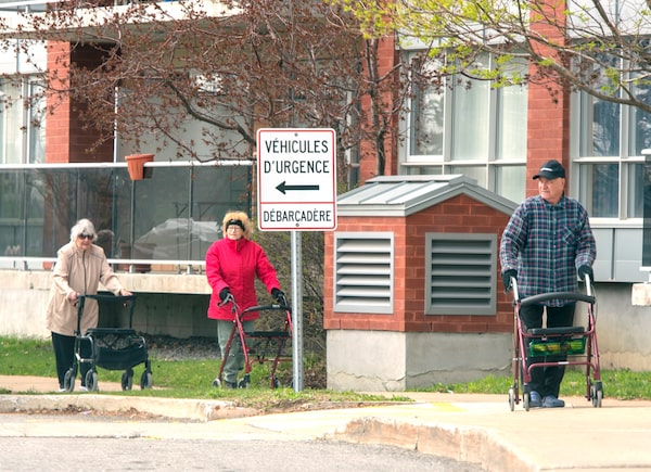 Seniors walk in front of their residence on May 5, 2020, in Montreal. Care home residents in Quebec can now walk outside alone, and visit with family outdoors – with physical distancing, of course.Ryan Remiorz/The Canadian Press