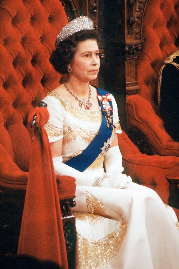 Queen Elizabeth officially opens the session of Parliament in the Senate chamber in Ottawa on Oct. 18, 1977.The Canadian Press