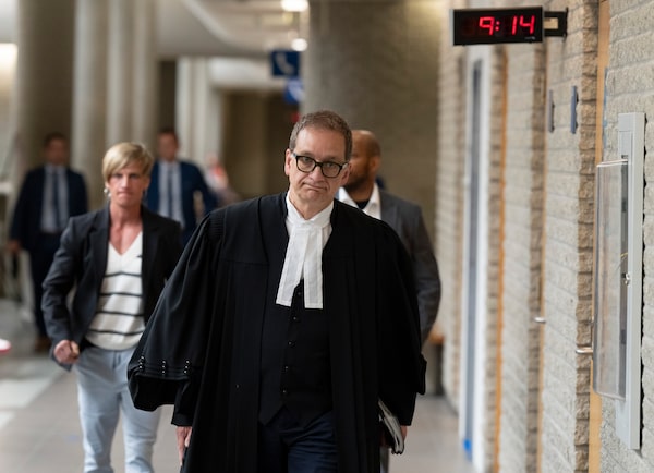 Federal Crown prosecutor Marc Cigana, followed by RCMP officers, arrives for a bail hearing at the courthouse in Longueuil, Que., on July 25.Christinne Muschi/The Canadian Press