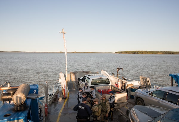 In Split Lake, Man., RCMP officers and vehicles take the ferry to York Landing at 7 a.m. Monday to search for fugitives Bryer Schmegelsky and Kam McLeod.Photography by Melissa Tait/The Globe and Mail