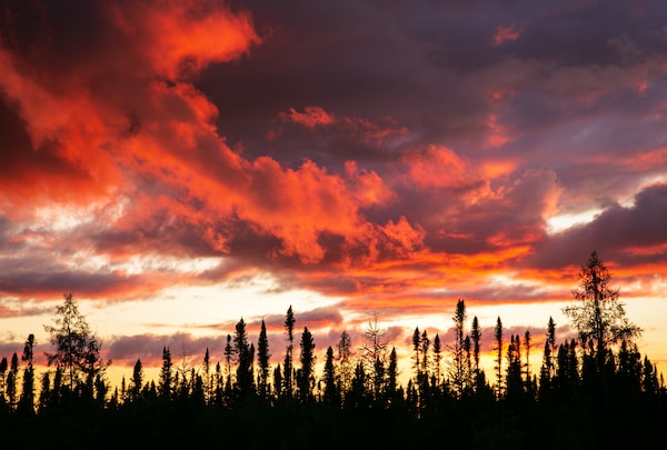 The sun sets over the forests near Fox Lake Cree Nation. This is by the ditch where the suspects are believed to have burned out their car before possibly escaping into the bush.