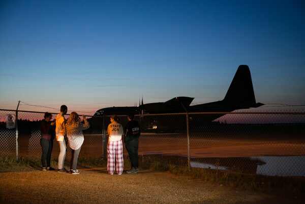 Gillam residents watch a Canadian Forces aircraft take off for another search in the bush to the north.