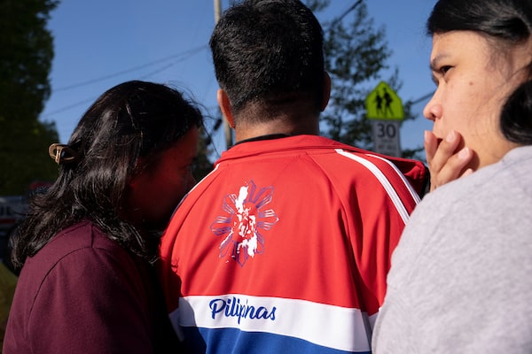 Maureen Bellen, Arnold Bellen, and AJ Bellen mourn together the day after a vehicle was driven into a crowd at a Filipino community Lapu Lapu day block party, in Vancouver, April 27.David Ryder/Reuters