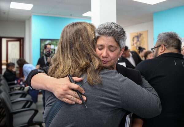 Mable Elmore (right), a member of the British Columbia Legislative Assembly, and RJ Aquino, is embraced at the end of a news conference the day after a man drove a vehicle into pedestrians at the annual Lapu-Lapu festival celebrating Filipino culture, in Vancouver, on April 27.NAV RAHI/AFP/Getty Images
