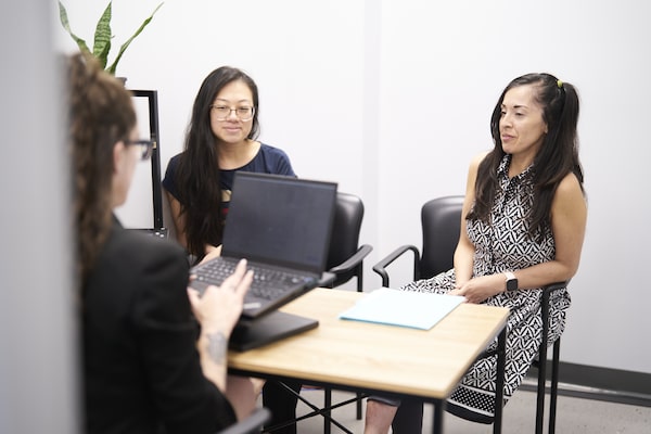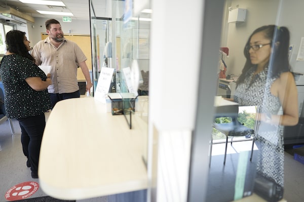 Renee Primeau, Systems Navigator at London InterCommunity Health Centre, speaks with her colleagues Psych Co-ordinator Carol Wat and Client Care Support worker Margarita Ramirez at their office in London, Ont., on May 29.Geoff Robins/The Globe and Mail