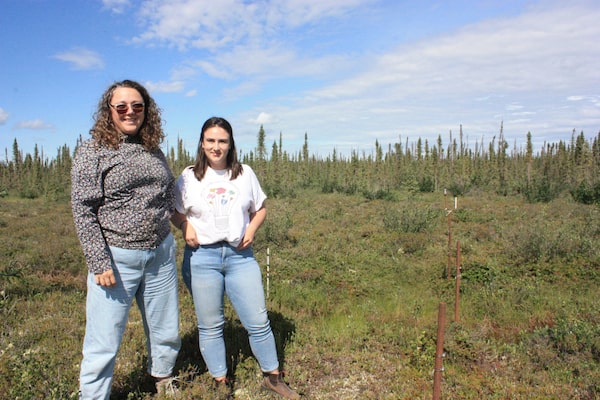 Erica Hille, acting director at the Western Arctic Research Centre, left, and Jennifer Humphries, permafrost specialist at the Aurora Research Institute survey a monitoring site in Inuvik, N.W.T., on July 5.Emily Blake/The Canadian Press