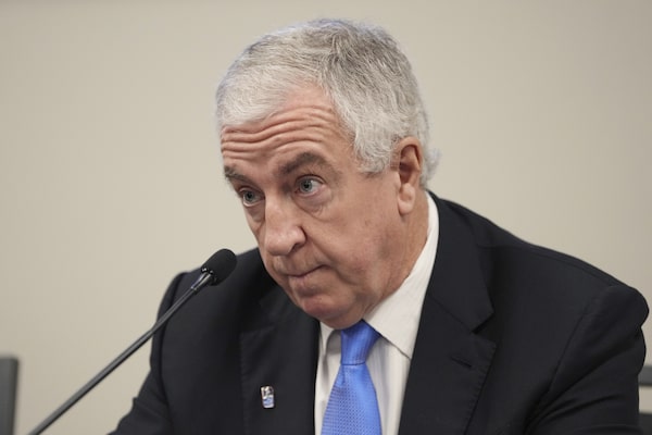 Luc Tardif, International Ice Hockey Federation president, answers questions from reporters during a news conference at the IIHF World Junior Hockey Championships in Halifax, Nova Scotia, on Jan. 5. Tardif said Sunday that so long as the war in Ukraine continues, Russian and Belarus will not be allowed to compete in International Ice Hockey Federation tournaments.Darren Calabrese/The Associated Press