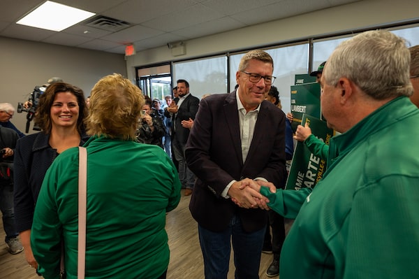Saskatchewan Party Leader Scott Moe shakes hands with supporters ahead of the launch of a provincial election campaign in Saskatchewan, in Saskatoon, on Oct. 1.Liam Richards/The Canadian Press
