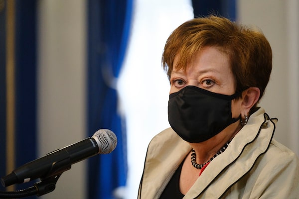 Saskatchewan Finance Minister Donna Harpauer speaks at Government House in Regina on Nov. 9, 2020.Michael Bell/The Canadian Press