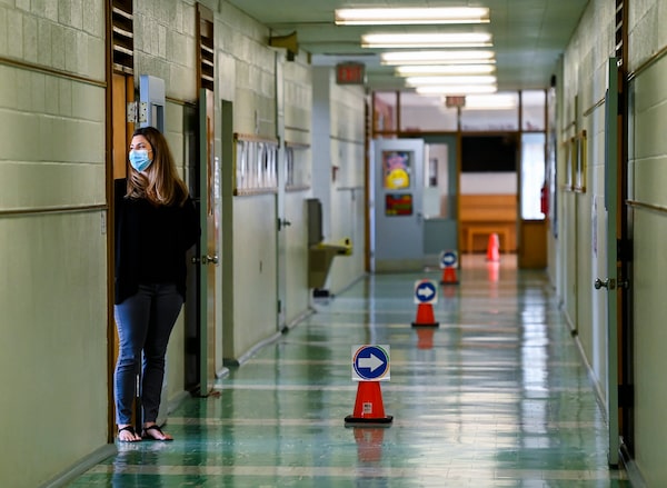 Grade two teacher Vivian Mavraidis looks out into the hallways at Hunter's Glen Junior Public School during the COVID-19 pandemic in Scarborough, Ont., on Sept. 14, 2020.Nathan Denette/The Canadian Press