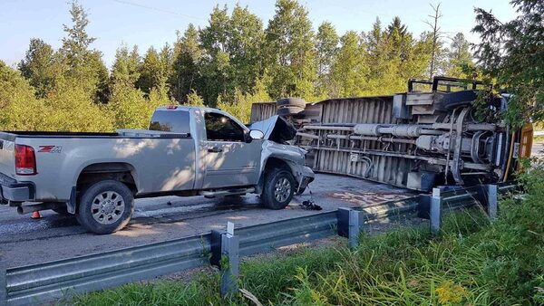 A pickup truck and flipped school bus are shown following an accident in Innisfil, Ont.HO/The Canadian Press