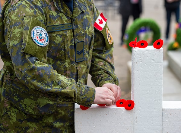 Poppies are placed on a cross at the end of Remembrance Day ceremonies at the Grand Parade in Halifax in 2020.Andrew Vaughan/The Canadian Press