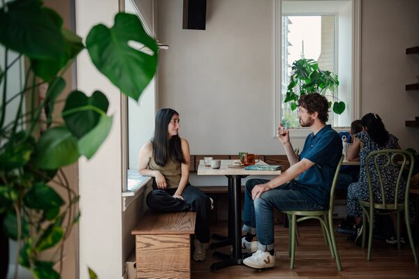 Amanda Tully and Steven Neville (left), spouses and co-owners of Kanoo Coffee in Guelph, Ont, enjoy a drink and conversation in their shop on July 20. In a bid to gently nudge customers to take a break from screens, the couple decided not to offer Wi-Fi and instead posted a small welcome sign encouraging guests to slow down.Galit Rodan/The Globe and Mail