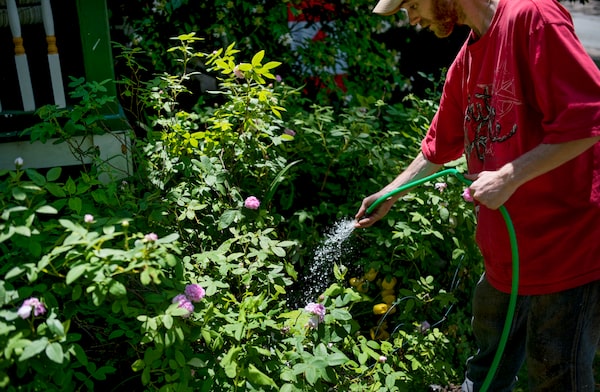 Ms. McDonald reaches for her cat, Annabelle, as Mr. Acker helps water the flowers.Darren Calabrese/The Globe and Mail