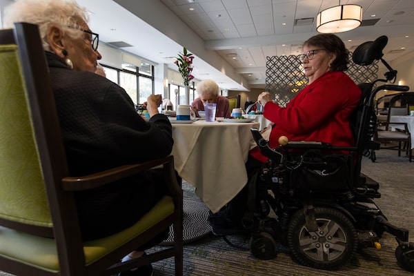 Some 180 residents live at the retirement community, in a mix of independent, assisted-living, and fully-assisted apartments. At about quarter to one, a group of five residents sit around a dining table, enjoying the sun filtering in through floor-to-ceiling windows.