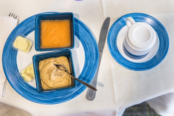Ms. Price, who is gluten intolerant, orders off of the à la carte menu instead. She tucks into her plate of salmon, tuna and egg salad.