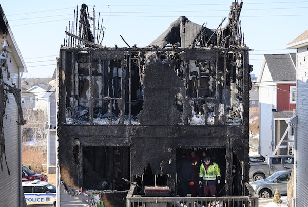 Police and firefighters investigate at the scene of a fatal house fire in the Spryfield community in Halifax on Feb. 19, 2019.Darren Calabrese/The Canadian Press