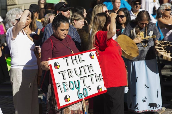 Sixties Scoop survivors and supporters gather for a demonstration outside a Toronto courthouse, on Aug. 23, 2016.Michelle Siu/The Canadian Press