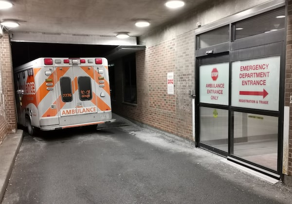 An ambulance is parked at the emergency department at the Lakeridge Health hospital in Bowmanville, Ont. on Jan. 12, 2022.Doug Ives/The Canadian Press