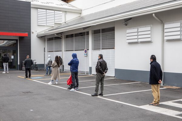 Italians keep distance as a safety measure as they line up to shop at a supermarket in Milan on March 11.Emanuele Cremaschi/Getty Images