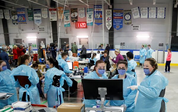 Medical staff prepare to receive patients for coronavirus screening at a temporary assessment center at the Brewer hockey arena in Ottawa on March 13, 2020.PATRICK DOYLE/Reuters