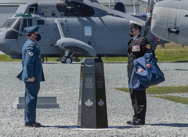 A sailor and an aviator observe a moment of silence after unveiling a memorial at 12 Wing Shearwater in Dartmouth, N.S. on the first anniversary of a CH-148 Cyclone helicopter crash that claimed the lives of six Canadian Forces members when the aircraft plunged into the ocean, on April 29.Andrew Vaughan/The Canadian Press