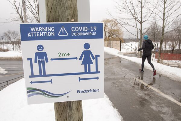 A physical distancing sign along a walking trail in Fredericton, on Feb. 4, 2021.Stephen MacGillivray/The Canadian Press