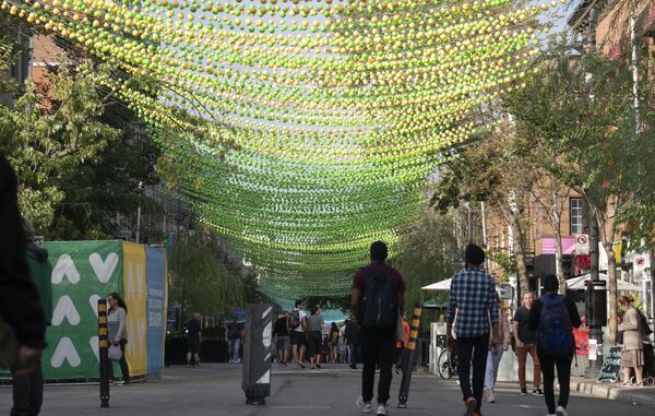 The art installation know as "18 Shades of Gay," is seen above Ste-Catherine street in Montreal's Gay Village in Montreal on Sept. 3, 2019.Paul Chiasson/The Canadian Press