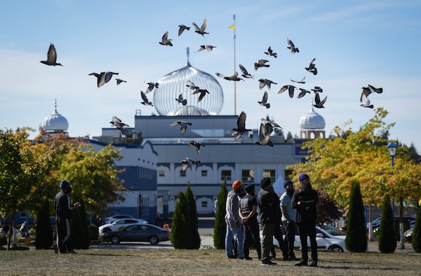 A flock of birds flies past as Moninder Singh, front right, a spokesperson for the British Columbia Gurdwaras Council, waits to speak to reporters outside the Guru Nanak Sikh Gurdwara Sahib in Surrey, B.C., on Sept. 18 where temple president Hardeep Singh Nijjar was gunned down in his vehicle while leaving the temple parking lot in June.DARRYL DYCK/The Canadian Press