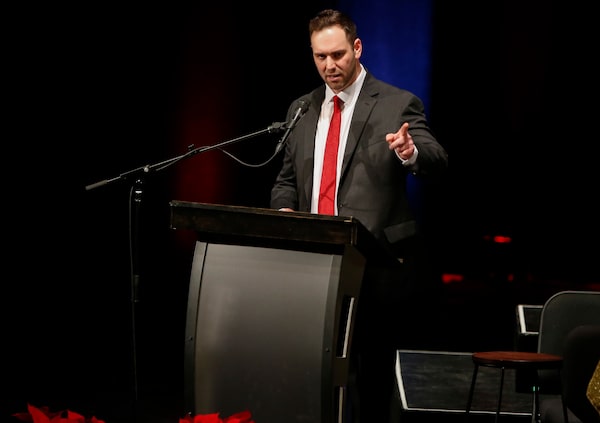 Ben Carr, son of the late member of Parliament Jim Carr, speaks at a memorial service for his father at the Centennial Concert Hall in Winnipeg, on Dec. 17, 2022.JOHN WOODS/The Canadian Press