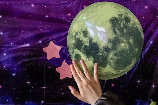 A visitor places a star-shaped note marking their predicted launch time on a decorative moon display as space enthusiasts gather for a watch party for the Artemis II mission, at the Gerstein Science Information Centre in Toronto on April 1.Carlos Osorio/Reuters