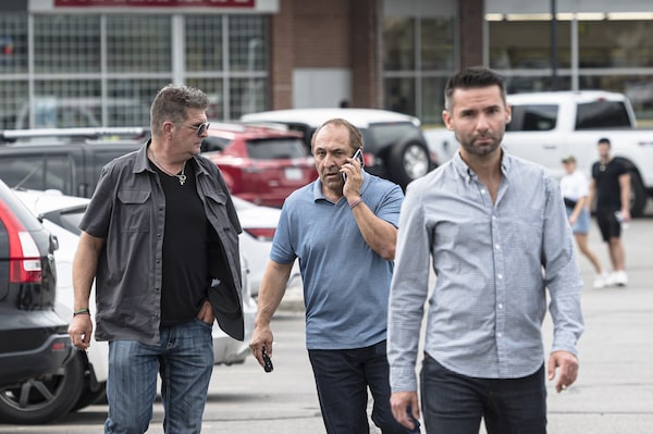 Spiros Papathanasakis, middle, walks with associates outside Toronto city councillor Gary Crawford's campaign office on Sept. 18, 2022.Christopher Katsarov/The Globe and Mail
