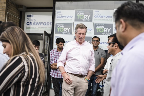 A week later, on Sept. 18, Mr. Papathanasakis was back at the campaign office for a speech by Mr. Tory. On that day, the incumbent mayor appeared in Scarborough – where he shares office space with Mr. Crawford – and Mr. Papathanasakis was photographed entering and leaving the premises by a Globe photographer.