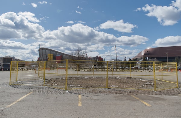 The place where Calgary's 125 year old Stampede Elm tree stood lays baren with the Scotiabank Saddledome looming in the background on April 9.LOUIS G M OLIVER/The Globe and Mail