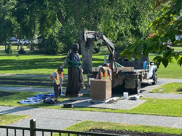 “The face was pushed in, the arm was scraped, and the whole base was totally crooked, too,” Charles Brunet, the third-generation owner of Brunet Monuments, recalled Friday as he and a crew of workers reinstalled the statue under a sweltering sun.
