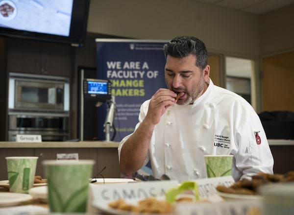 From left to right, judges Yasmin Akhtar, Lui Xia Lee and David Speight, prepare to taste the ginger cookies with mealworms, created by students Mariam Alkandari and Evelyn Springer, during the Great UBC Bug Bake Off, on campus in Vancouver on Nov. 28.Tijana Martin/The Globe and Mail