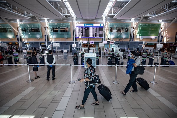 Travellers walk past the Air Canada domestic check-in area at Vancouver International Airport in July, 2021. The top court deemed the pandemic travel rules to be in bounds with the reasonable limits on rights and freedoms in Section 1 of the Charter.DARRYL DYCK/The Canadian Press