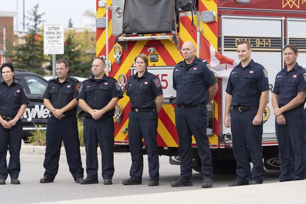 Members of Mississauga Fire Services pay their respects at the scene where Const. Andrew Hong was killed in Missisauga on Sept. 13.Arlyn McAdorey/The Canadian Press