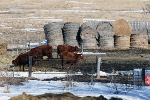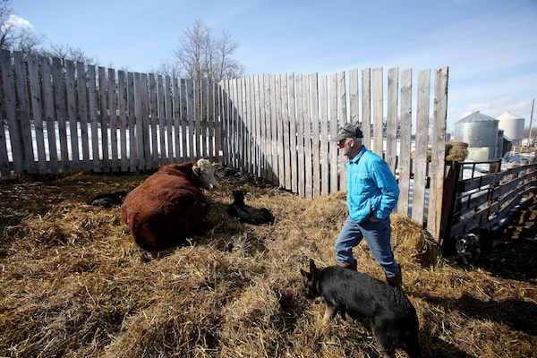 Ian Grossart checks on cattle at his farm just south of Brandon, Man., on April 3.Shannon VanRaes/The Globe and Mail