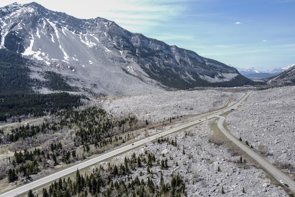 Traffic travels along Highway 3 through the remains of the Frank Slide, in the Crowsnest Pass, near Blairmore, Alta., on May 3.Jeff McIntosh/The Canadian Press