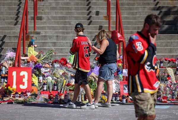 Hockey fans Jackson Henderson and his mom Deb Tetley pay their respects to former Calgary Flames star Johnny Gaudreau and his brother Matthew at a memorial on the steps at the Scotiabank Saddledome on Aug. 31, in Calgary.Leah Hennel/Getty Images