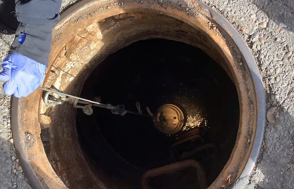 An autosampler is lowered through an access port into a sewer pipe in the city wastewater collection system as part of a COVID-19 monitoring study in Calgary.UNIVERSITY OF CALGARY/Reuters