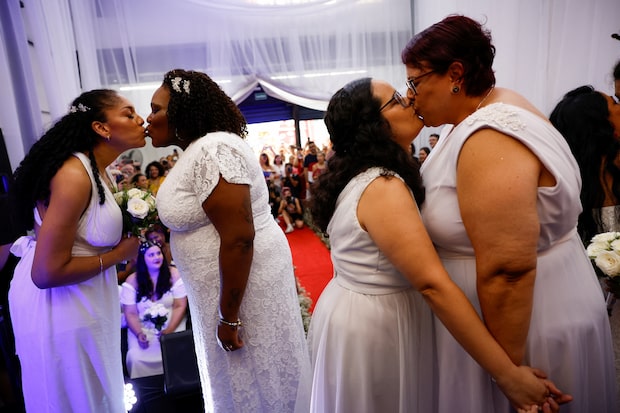 Couples kiss at a joint same-sex wedding ceremony in Sao Paulo on Dec. 16, organized by an NGO and residential shelter.