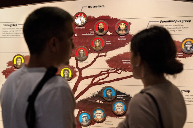 Exhibits at the Smithsonian Museum of Natural History in Washington show modern humans, Homo sapiens sapiens, at the top of a family tree shared with Neanderthals and Denisovans.