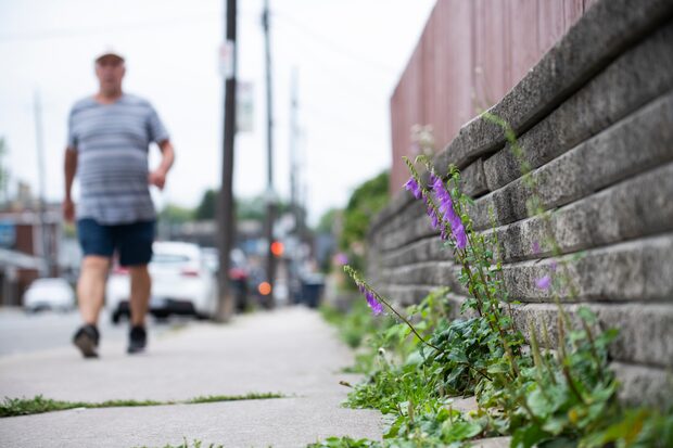 Creeping bellflower, an invasive plant, growing along Rogers Road in Toronto.